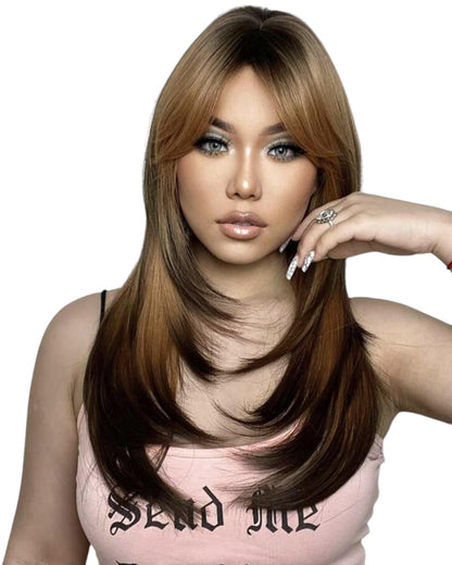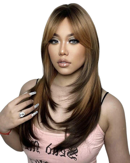 Long Layered Wig in Tipped Caramel & Chocolate Brown.