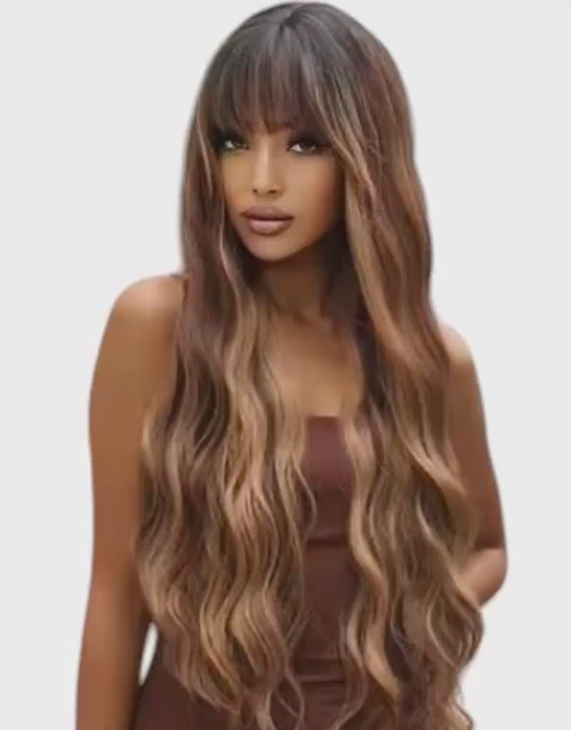 Wavy long streaked multi tonal, fringe, soft wave, comfortable lightweight wig providing a stylish and on trend look.