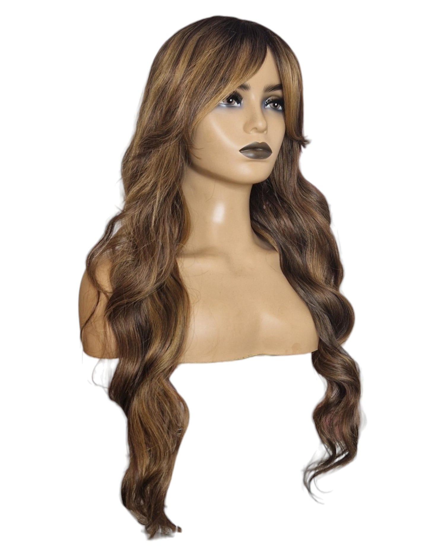 Brown graduated ombre with caramel tones. Face framing fringe bangs and a gentle wave.