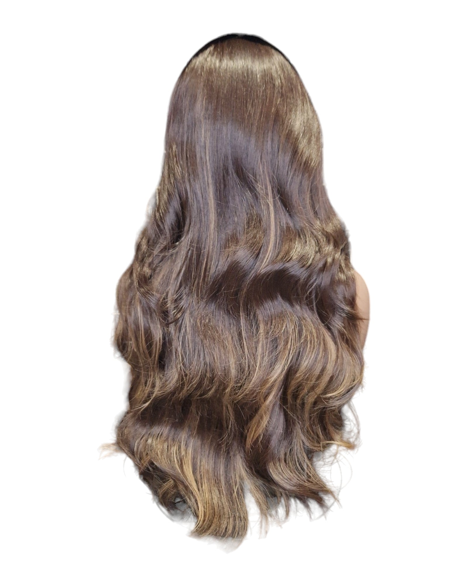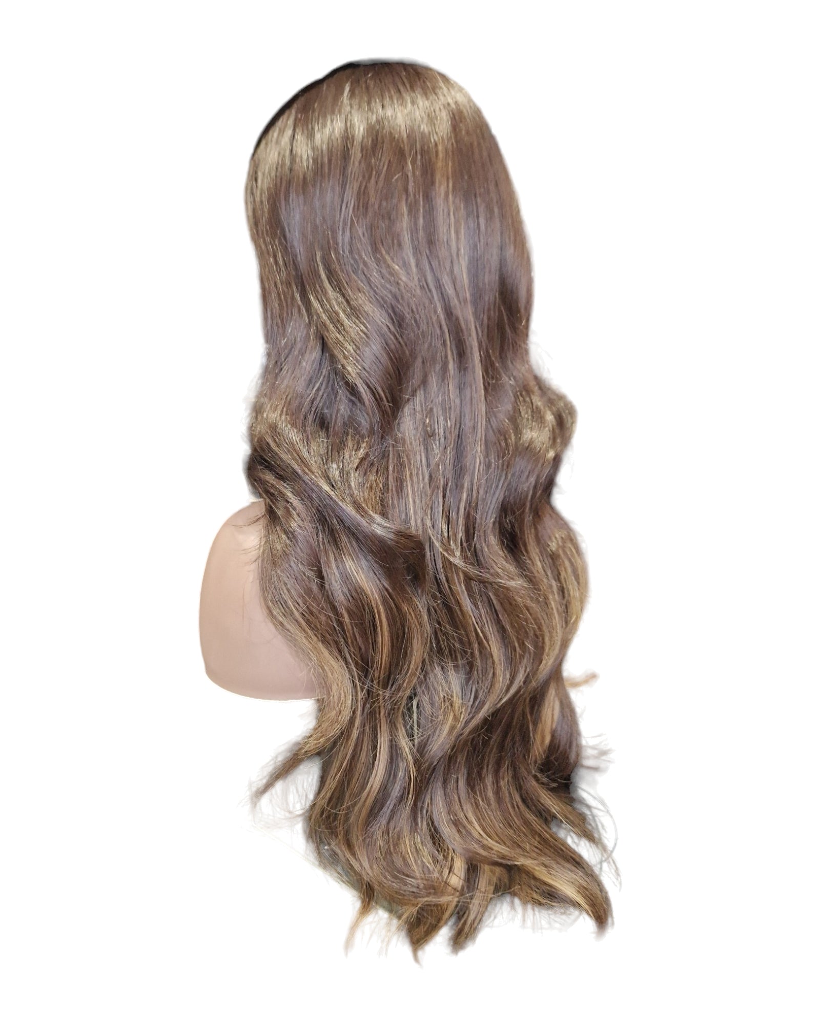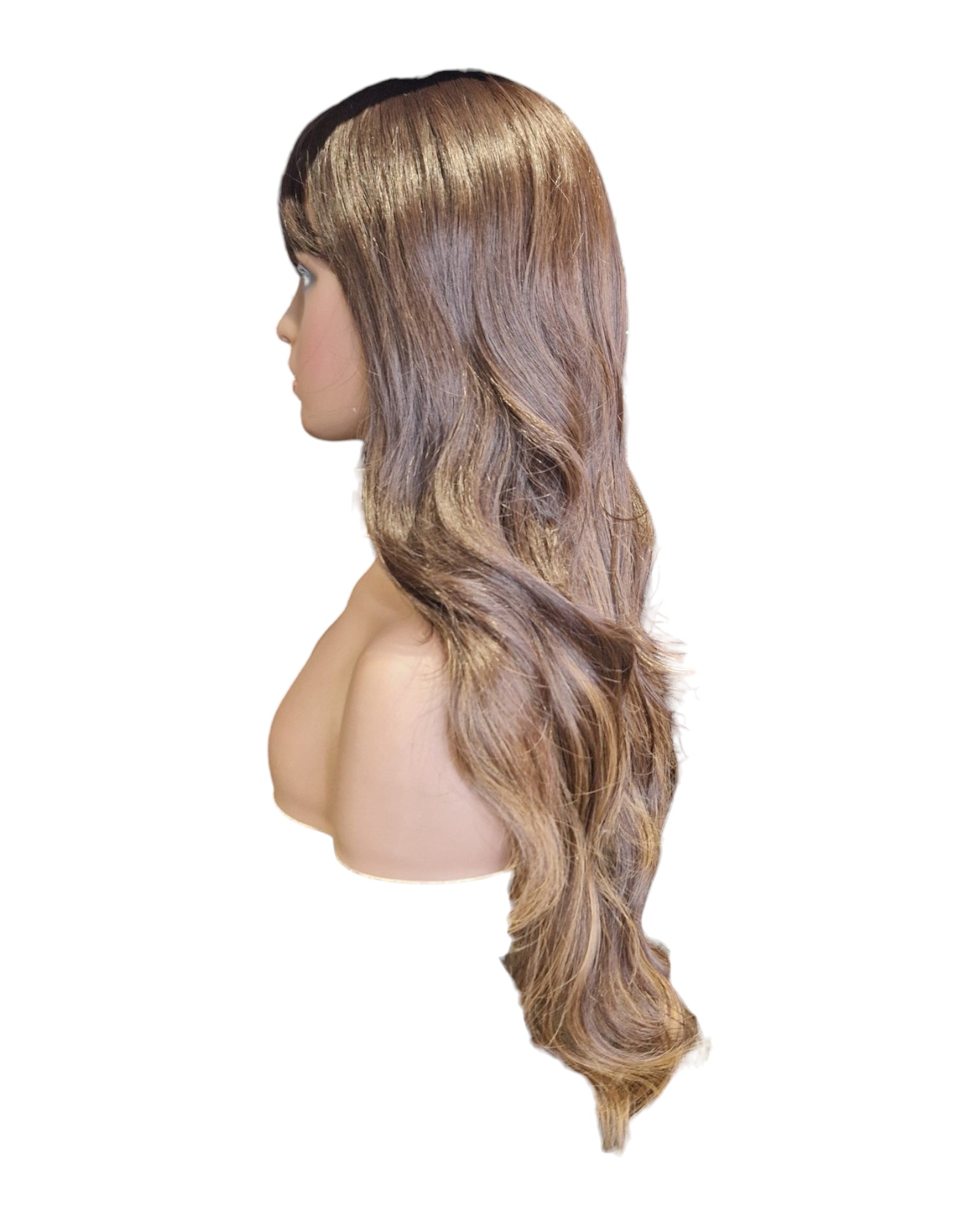 Brown Long Wavy Lowlights Wig With Fringe. Talia