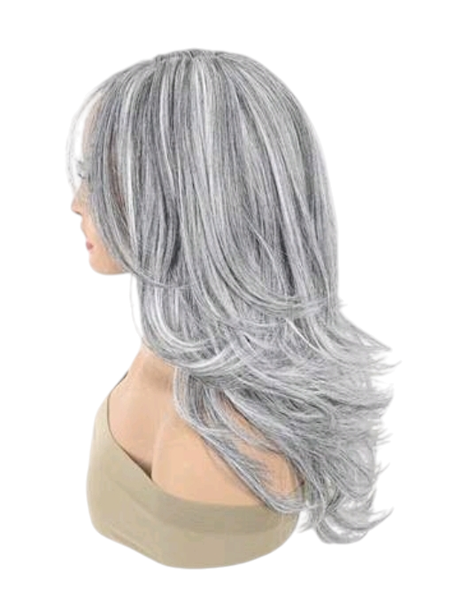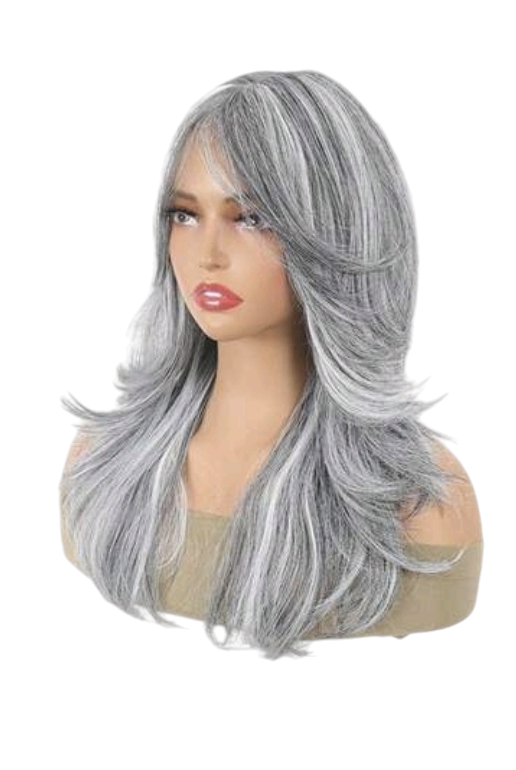 Featuring a face framing curtain drape centre part style with layered grey and white highlights, this wig is perfect for all generations.