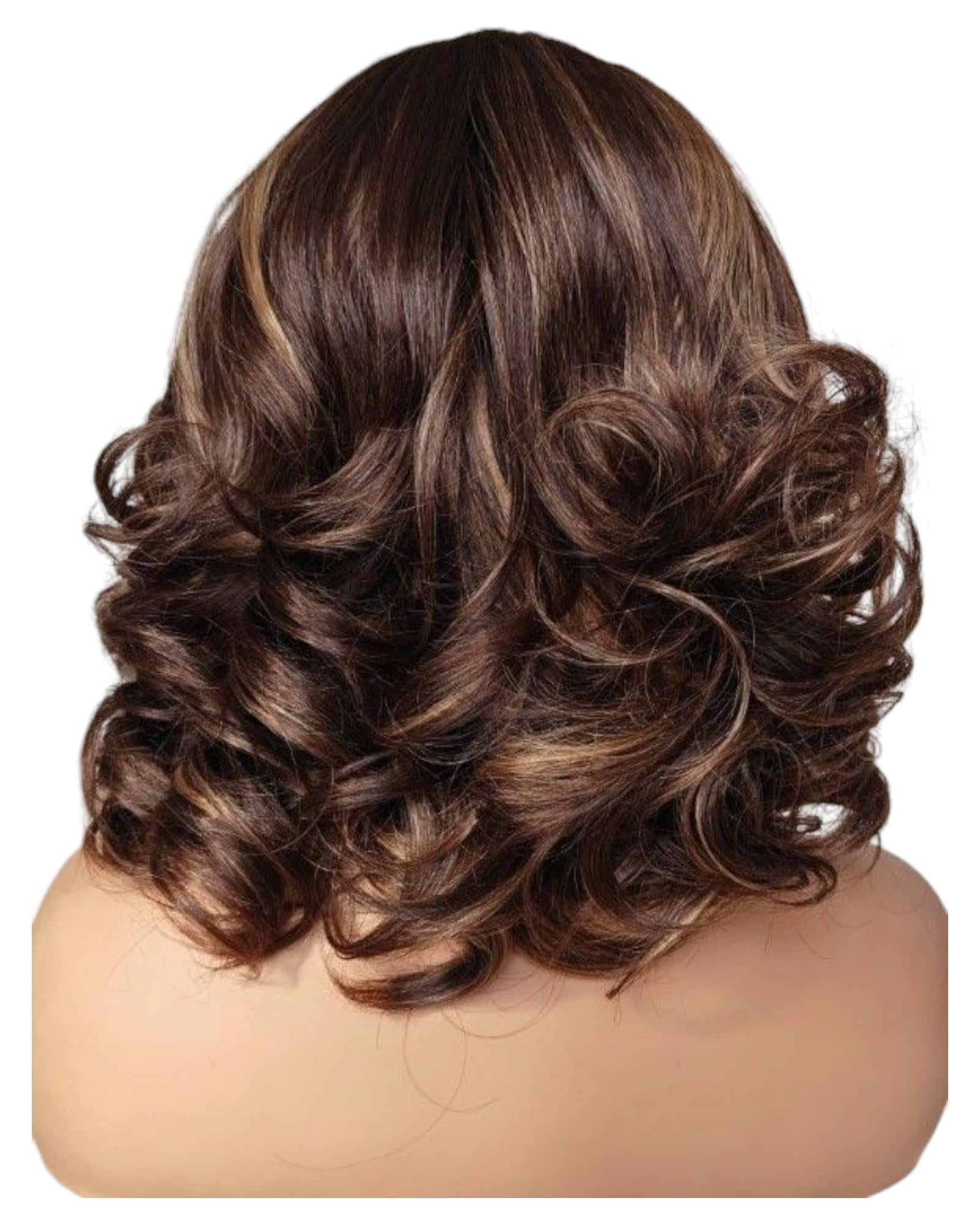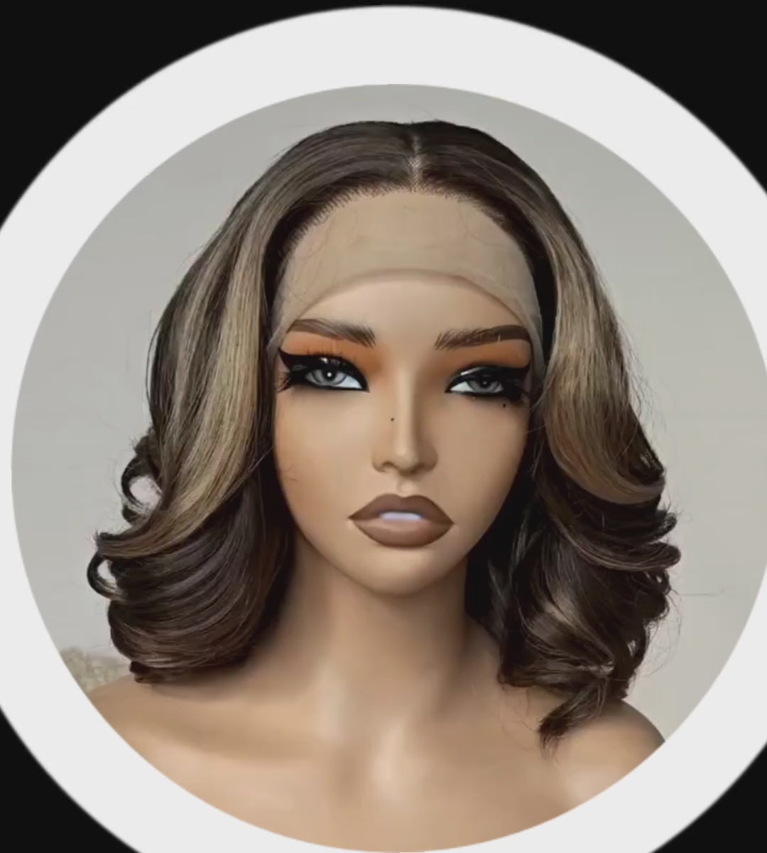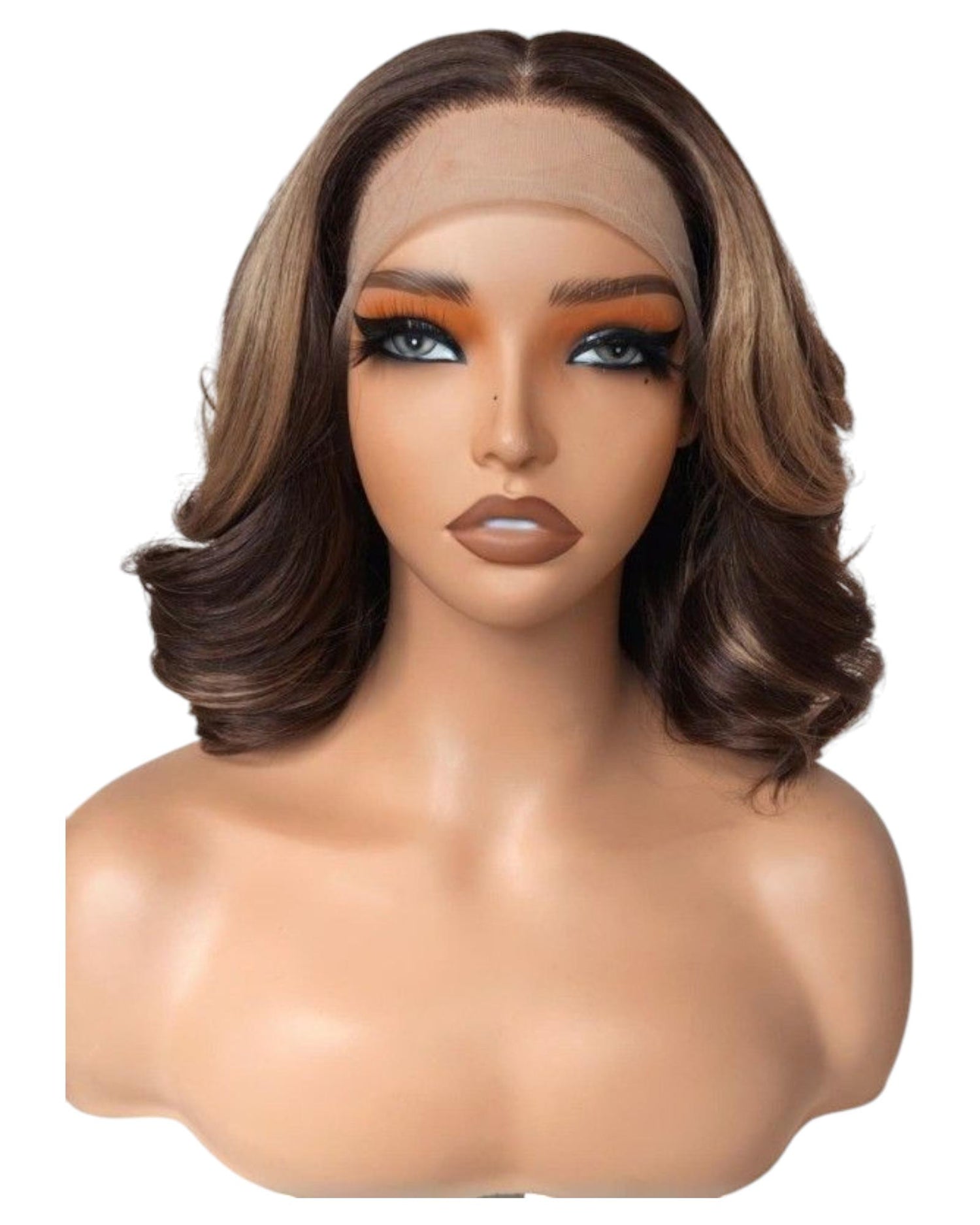 Brown highlights, blonde bangs to accentuate the face, soft lace, long centre part, mid length, wavy layered texture. Fresh blow out style, sophisticated stylish bob wig.