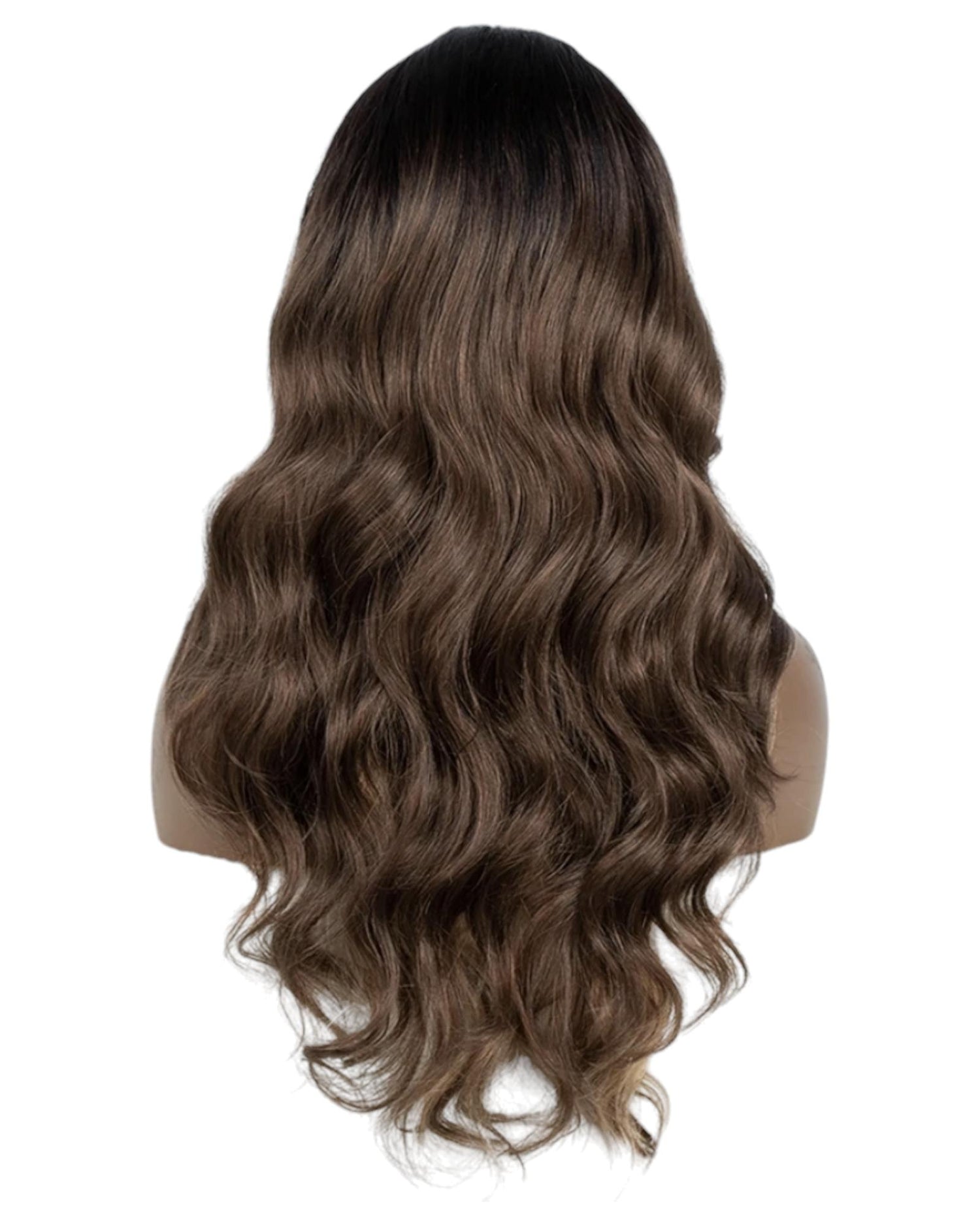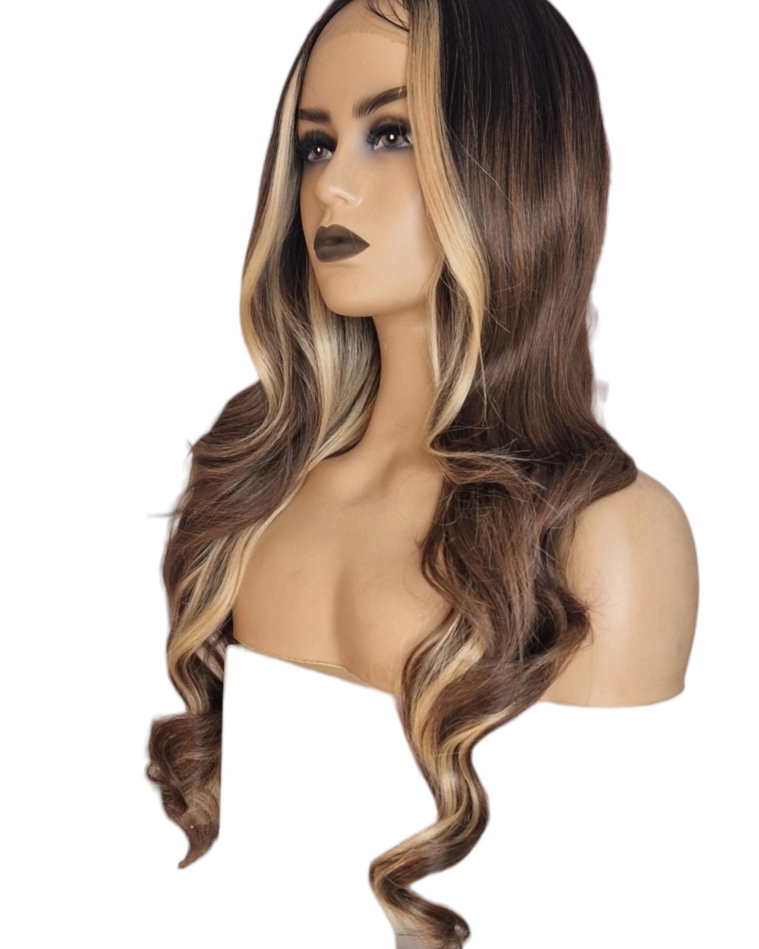 Dark to Mid Brown rooted ombre with middle partFace framing fringe bangs in blonde a gentle wave. 26inches long.