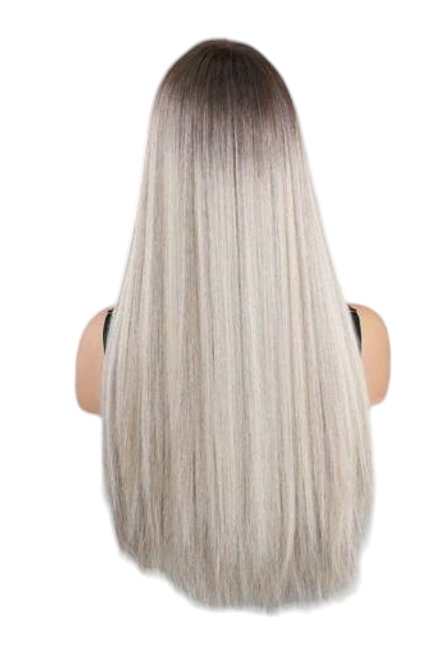 Soft synthetic hair wig with fringe on a root growth Platinum blonde shade.