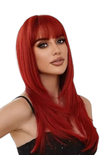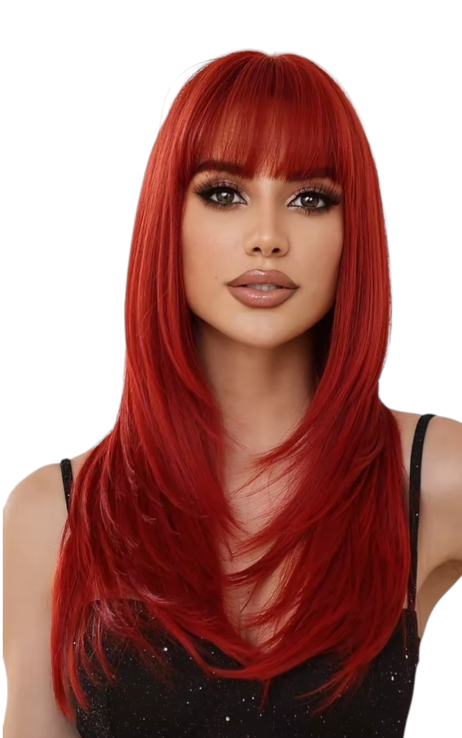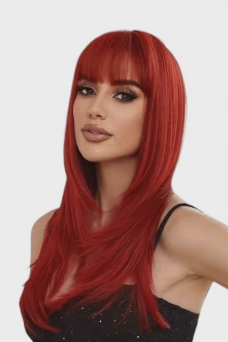 Soft synthetic styleable wig with fringe in a deep reddish pink shade.