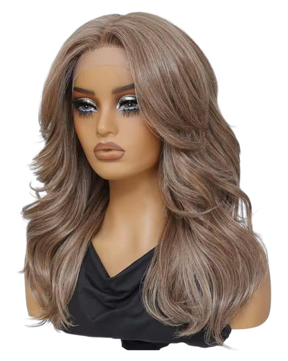 Soft lace, centre parting, mid length, soft wavy layered texture. Baby hairs.