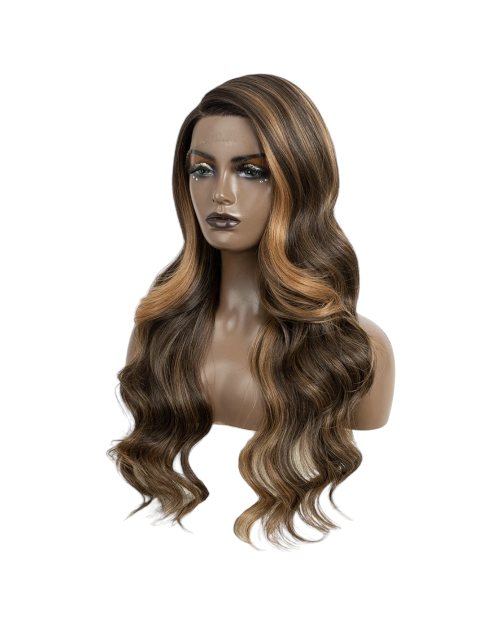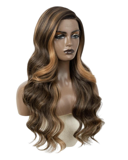 Rich Brown and Caramel wig with a curved parting. Long side framing bangs and a gentle wave texture. 26 inches long.