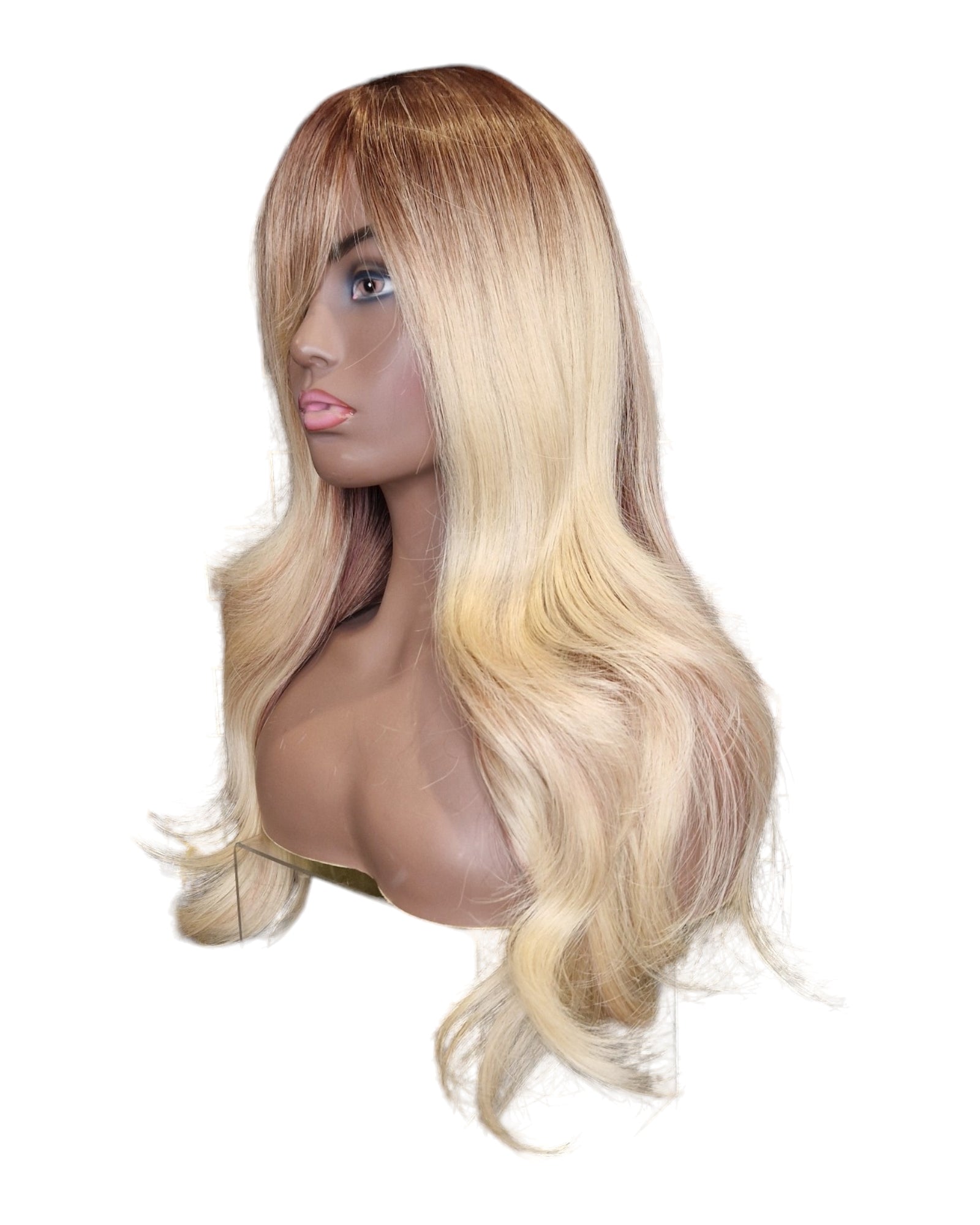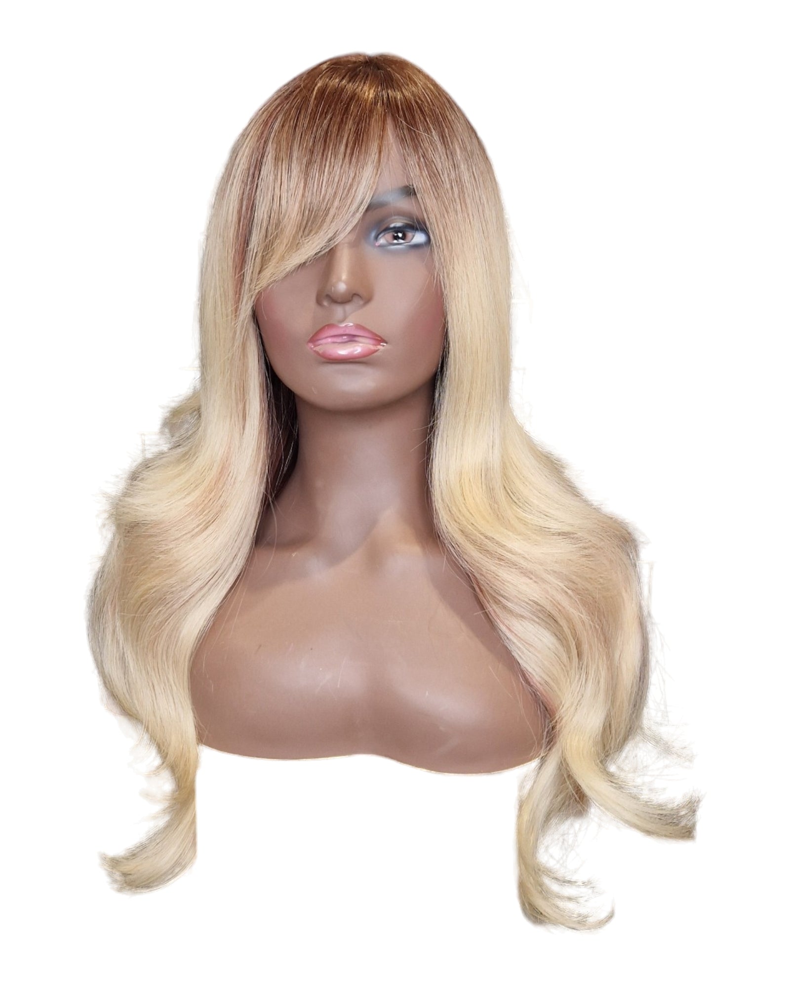 Blonde fringe hairstyle with Pinkish Brown Under layers. Long bangs suitable for most face shapes. Darker root effect on crown.
